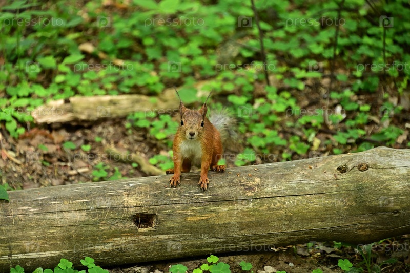 Красная милая белка на бревне в лесу