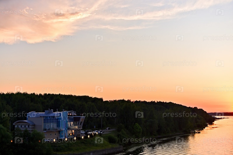 Вид на модный ресторан на берегу Волги при закате солнца