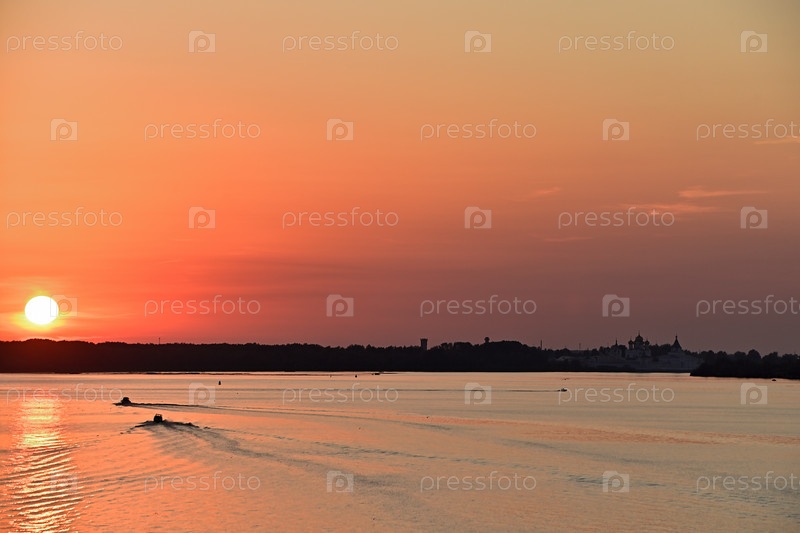 Прекрасный вечерний закат на реке Волга