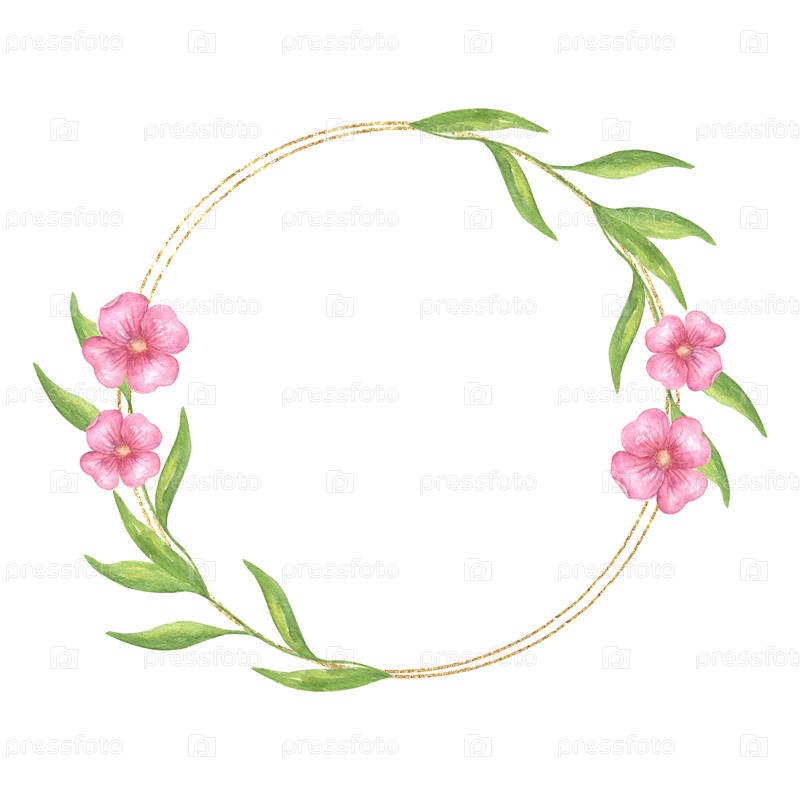 Круглый венок с розово-фиолетовыми цветами в золотой раме