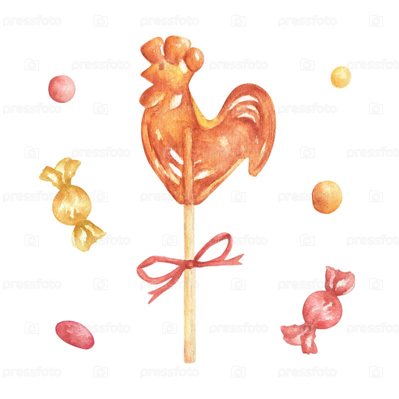 Акварельная иллюстрация карамельного петуха на палочке.Ручно нарисованные конфеты и леденецы