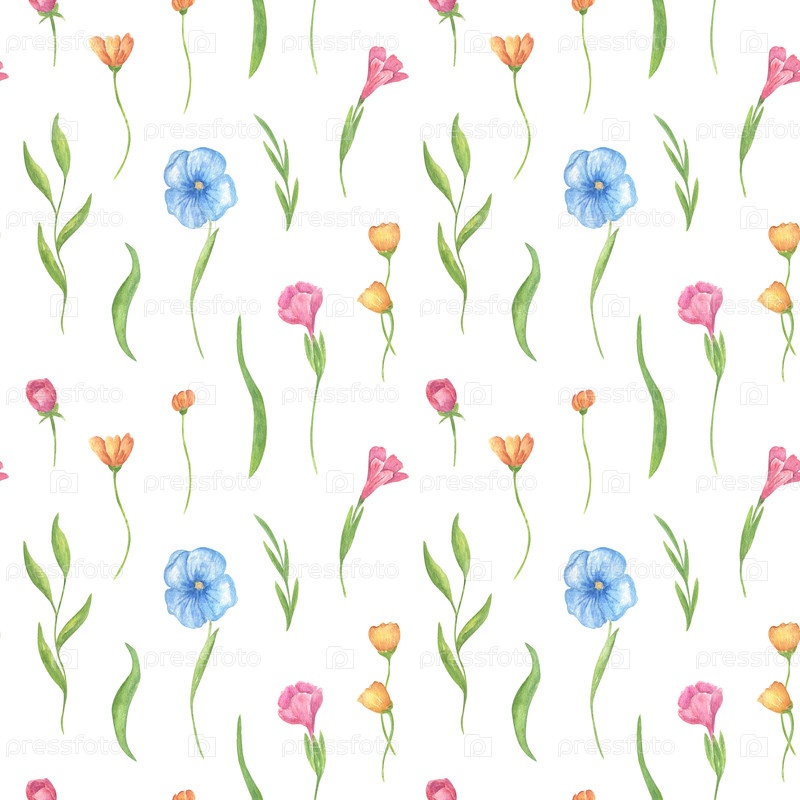Бесшовный цветочный акварельный рисунок, ручная живопись, голубые, розовые и желтые цветы