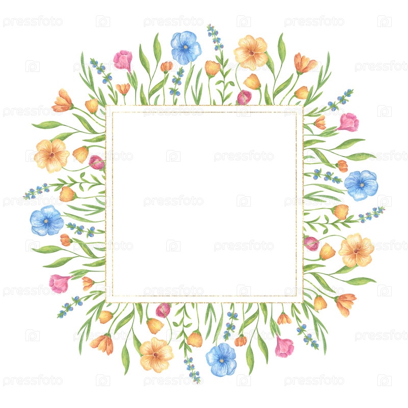 Квадратная рама с золотой границей, украшающая акварельными красками луговые цветы и зелень
