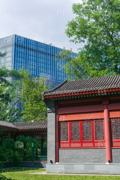 Традиционная китайская архитектура на фоне современных городских зданий