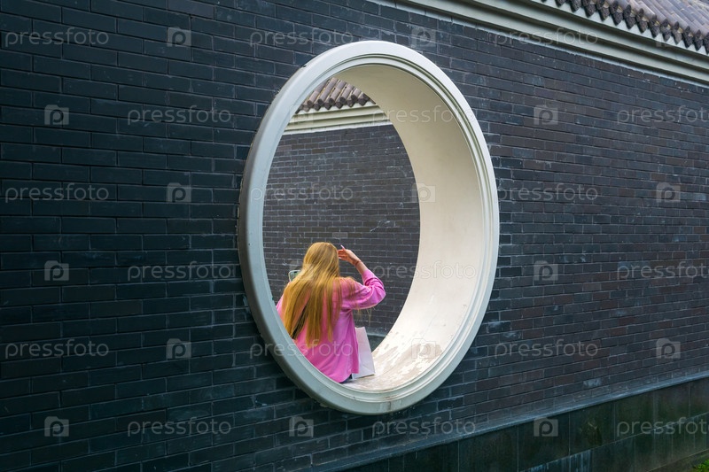Молодая женщина сидит в круглом отверстии в заборе китайского сада