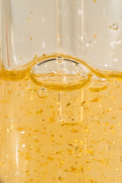 Сывороточная пипетка 24k Золотые частицы капают в бутылку на бежевом фоне. косметический продукт