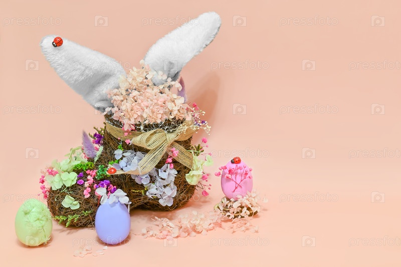 Гнездо с кроличьими ушами, окруженное цветными яйцами
