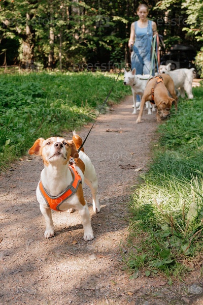 Собака Джек Расселл Терьер в красном подвеске на поводке гуляет по парку