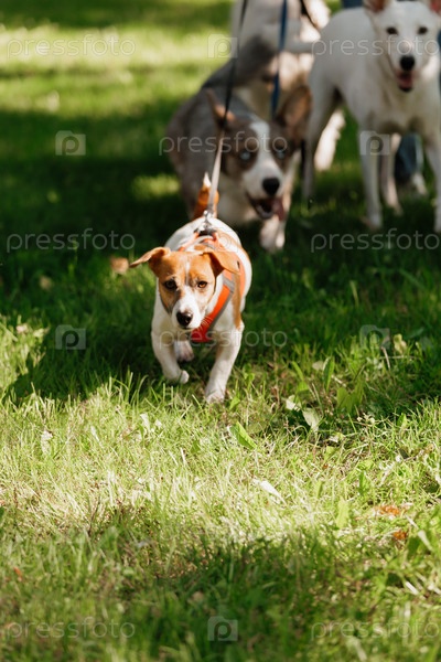 Собака бежит через поле с другими собаками.Собака носит красный пояс.Джек Рассел Терьер