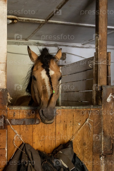 Коричневая лошадь с косыми волосами стоит в деревянном конюшне