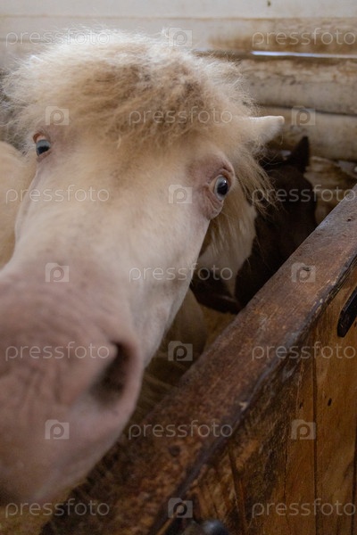 Голова белой лошади смотрит на коричневый деревянный забор. лошадь смотрит в камеру