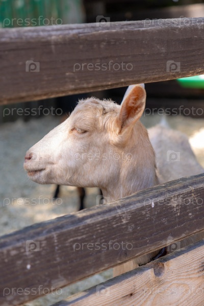 Коза стоит перед деревянным забором. животное на ферме в конюшне