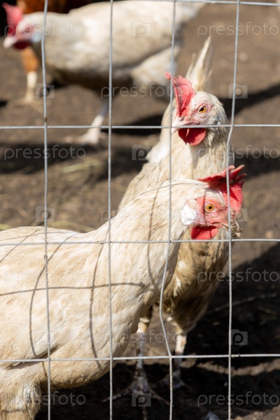 Группа цыплят, жующих землю и траву в клетке. падок огражден проволокой