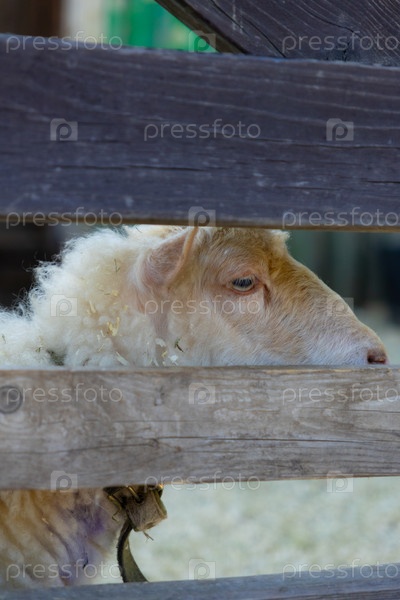 Овцы стоят перед деревянным забором. животное на ферме в конюшне
