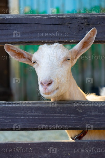 Коза стоит перед деревянным забором. животное на ферме
