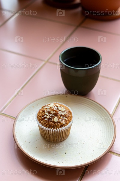 Чашка кофе и кексы на белой тарелке на розовом плиточном столе