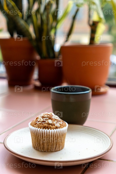 Чашка кофе и кексы на белой тарелке на розовом плиточном столе. зеленые растения в горшочках на столе