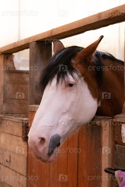 Голова бело-коричневой лошади выглядывает из-за коричневого деревянного забора