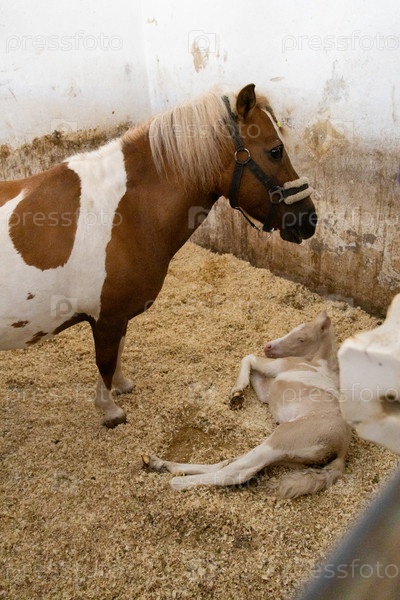 Лошадь и жеребенок отдыхают, животные стоят на полу из пиломатериалов