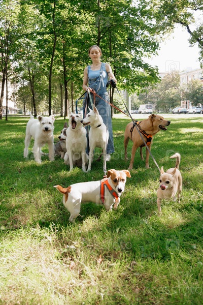 Молодая девушка гуляет с собаками на газоне в парке. понятие дружбы, домашнего питомца, отдыха