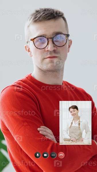Видеочат на экране смартфона или ноутбука. видеозвонок между двумя людьми, конференция по решению проблем
