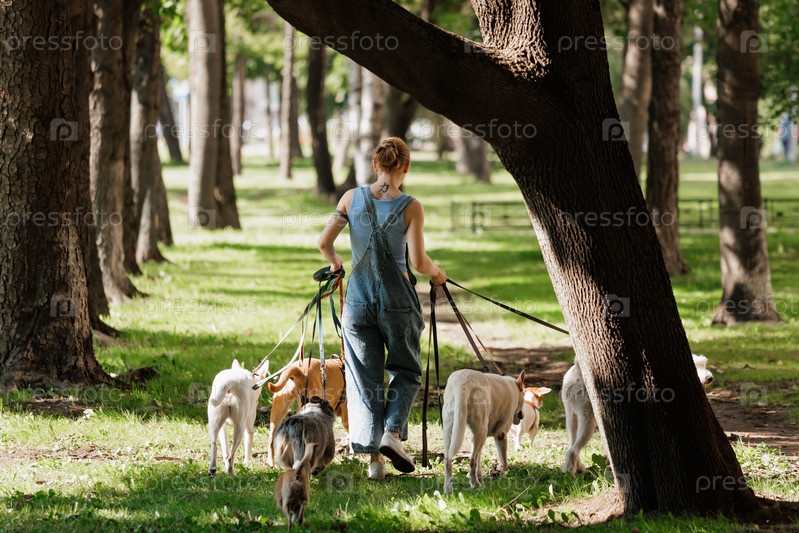 Женщина гуляет с собаками в парке, каждая собака на поводке