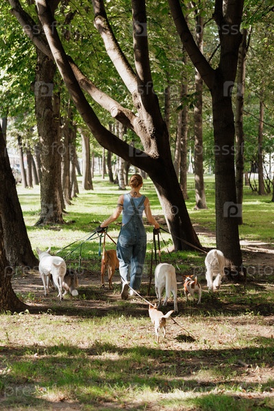 Женщина гуляет с собаками в парке, каждая собака на поводке