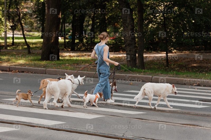 Группа домашних животных, заводчик собак на прогулке со своими питомцами