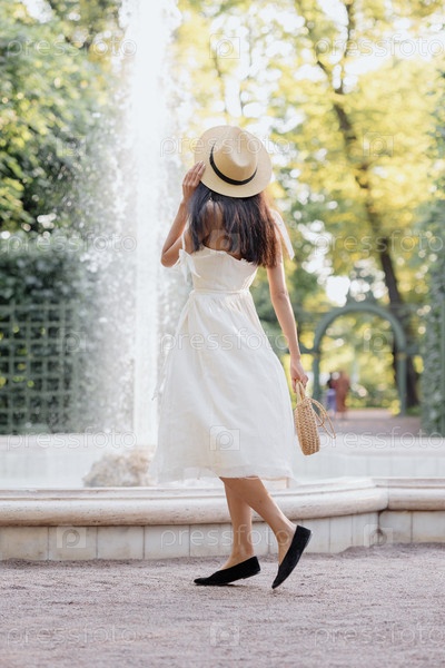 Счастливая афроамериканская женщина в белом платье, соломенной шляпе и сумке, позирует