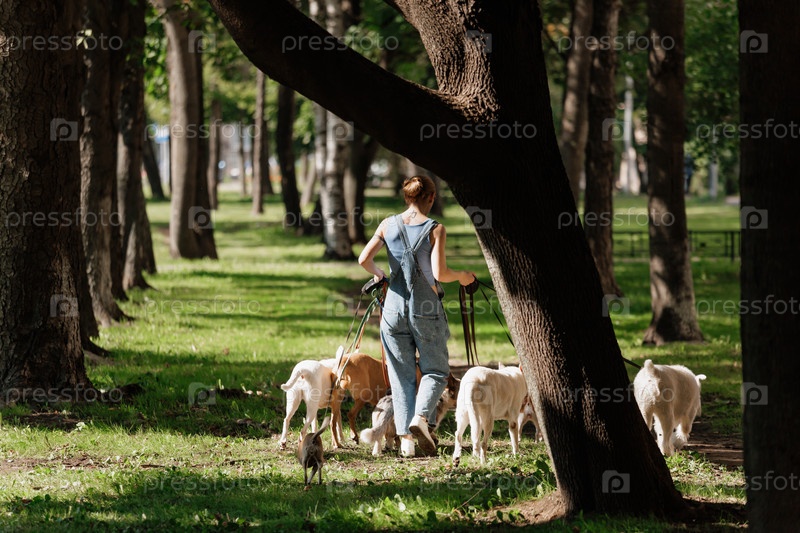 Женщина гуляет с собаками в парке, каждая собака на поводке