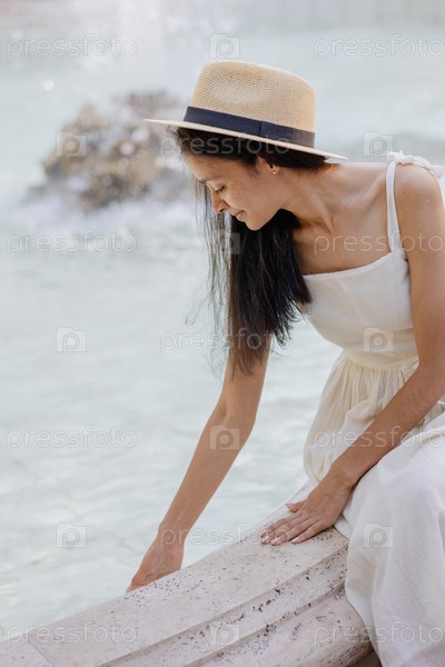 Молодая афроамериканка в белой соломенной шляпе сидит на фонтане из белого мрамора и касается воды