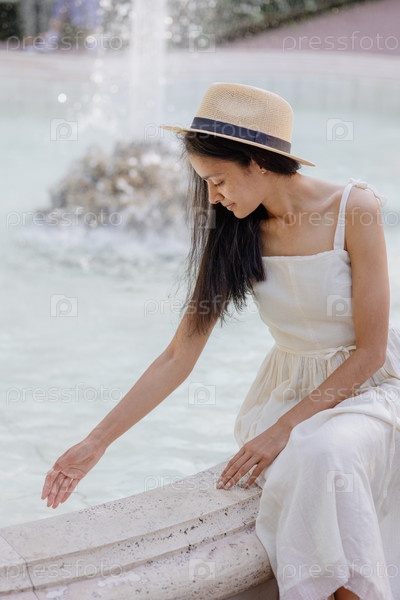 Молодая афроамериканка в белой соломенной шляпе сидит на фонтане из белого мрамора и касается воды