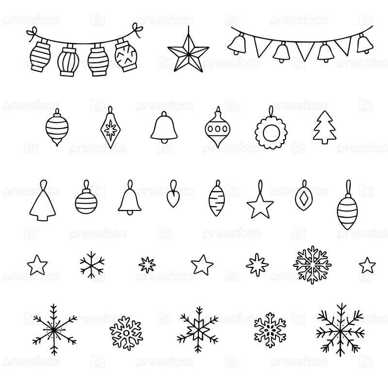 Векторная иллюстрация с рождественскими украшениями, такими как снежинки, звезды и колокола в простом стиле. идеально подходит для праздничных тематических дизайнов и проектов декораций на каникулы