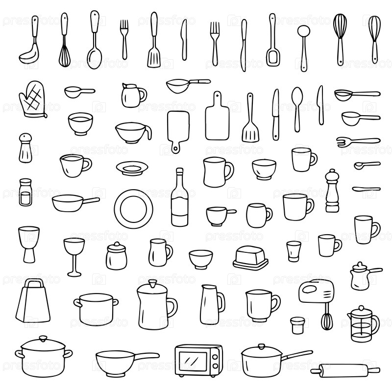 Векторная иллюстрация, изображающая разнообразную коллекцию кухонных приборов, включая ложки, вилки, чашки, сковородки и многое другое.Идеально подходит для конструкций на кулинарную тематику и образовательных материалов
