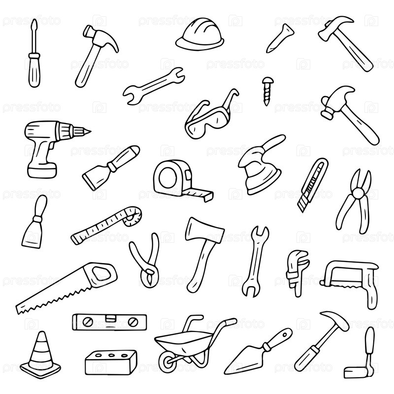 Черно-белая векторная иллюстрация с разнообразной коллекцией строительных инструментов. включает в себя молоток, отвертку, дрель, твердую шляпу, защитные очки и более важные предметы для проектов