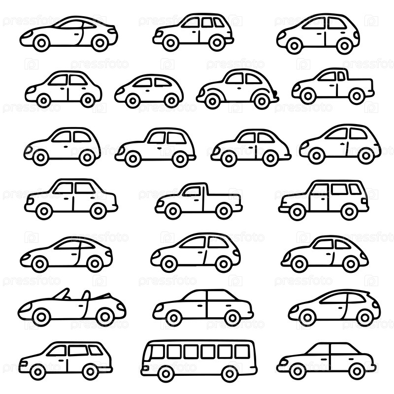 Векторная иллюстрация, показывающая различные контуры автомобилей, включая седаны, внедорожники и кабриолеты, расположенные в аккуратных рядах