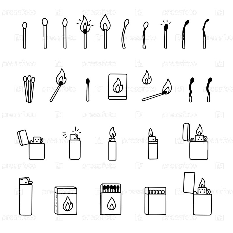 Векторная иллюстрация с прогрессированием спичек и зажигалки, показывающая различные этапы от воспламенения до тушения.Включает в себя подробные эскизы спичек, пламени и конструкции зажигателей