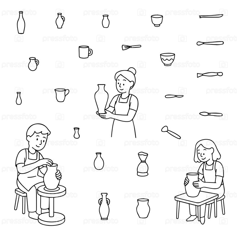 Векторная иллюстрация, показывающая людей, участвующих в производстве керамики.Различные этапы создания керамики изображены с использованием различных инструментов и выражений фокуса и творчества