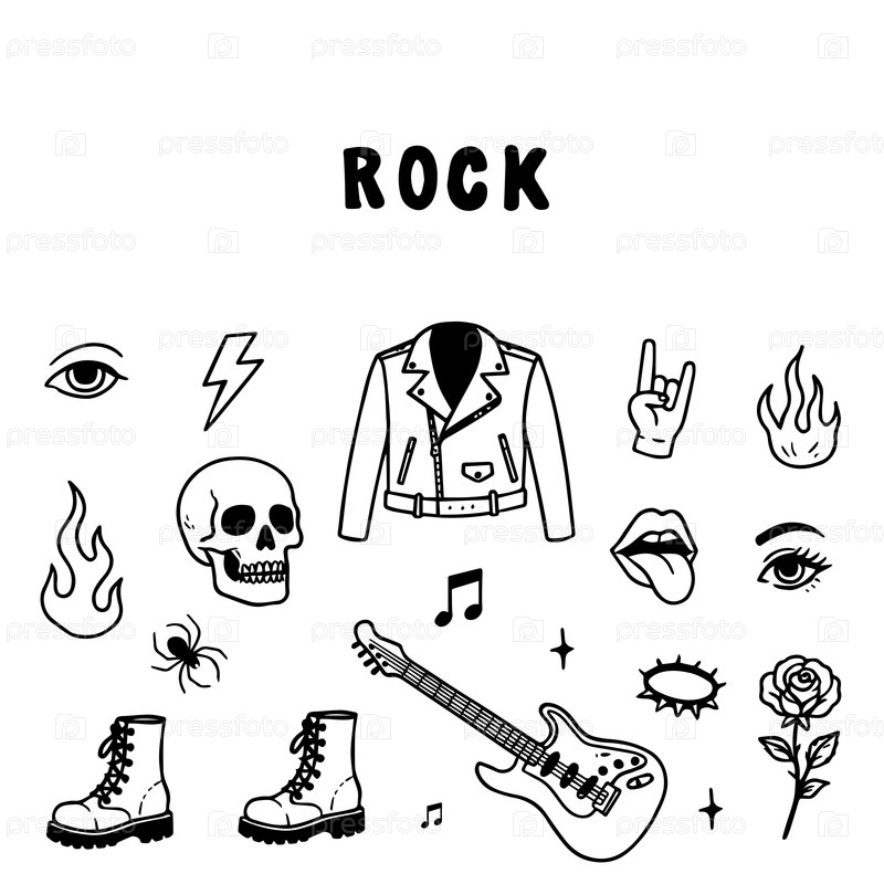 Векторная иллюстрация символов рок-музыки, включая кожаную куртку, электрическую гитару, череп и сапоги, захватывающая суть рок-культуры и стиля