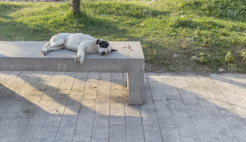 Щенок лежит на скамейке в парке. домашние животные