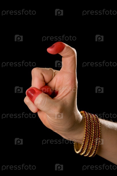 Женщина показывает жест "Петух", который используется во время классического индийского танца Бхарата Натьям. Также используется в других индийских классических танцах Кучипуди и Одисси