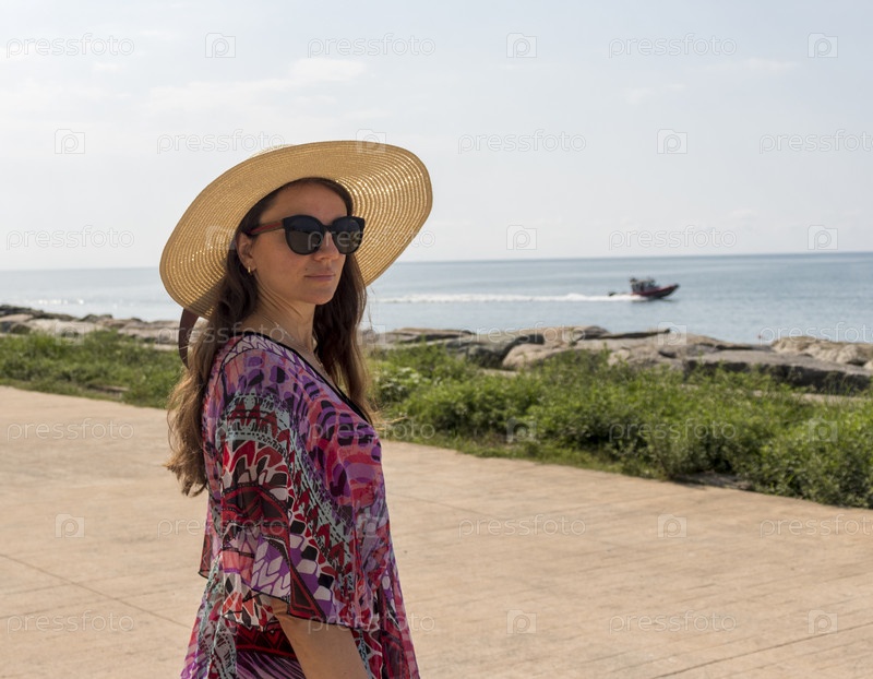 Привлекательная женщина с длинными волосами, одетая в короткое красочное пляжное платье и соломенную шляпу, позирует для фотографии