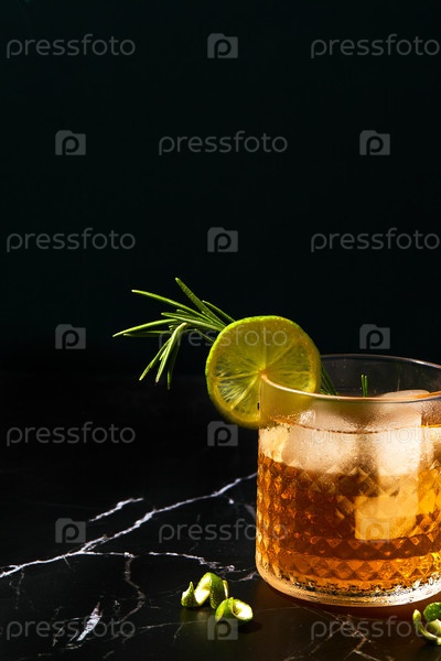 Алкогольный или безалкогольный коктейль с лаймом и розмарином на темном мраморном столе