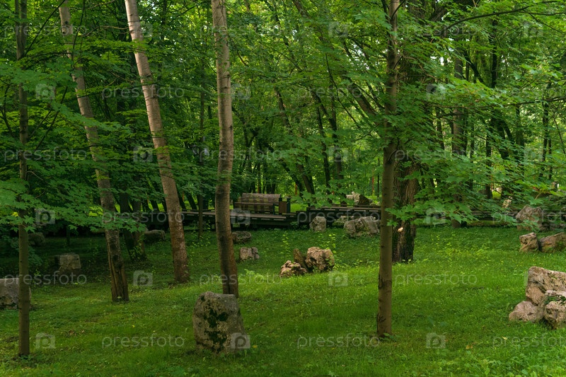 Ландшафт с зелеными деревьями, травой и камнями в парке