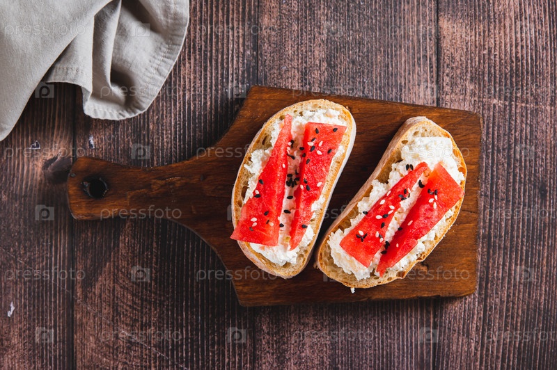 Закройте вкусный бутерброд с рикотой, арбузом и кунжутными семенами на верхний вид