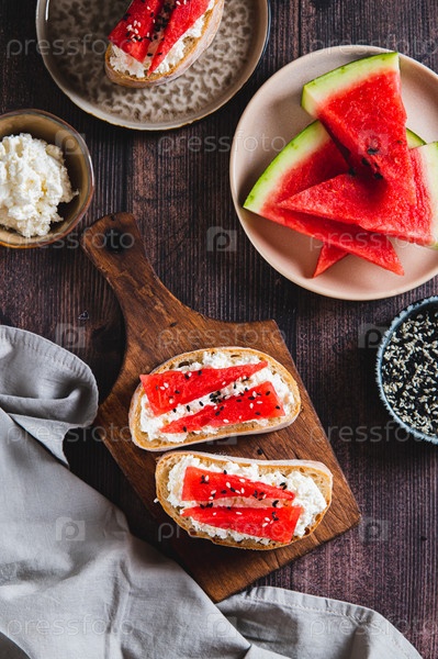 Легкие кростины с рикотой и арбузом на доске на столешнице и вертикальном видении