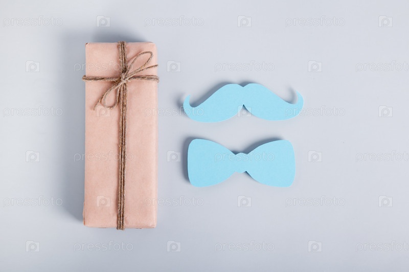 Концепция здоровья усов, подарок, бумажные усы и бабочка на синем фоне
