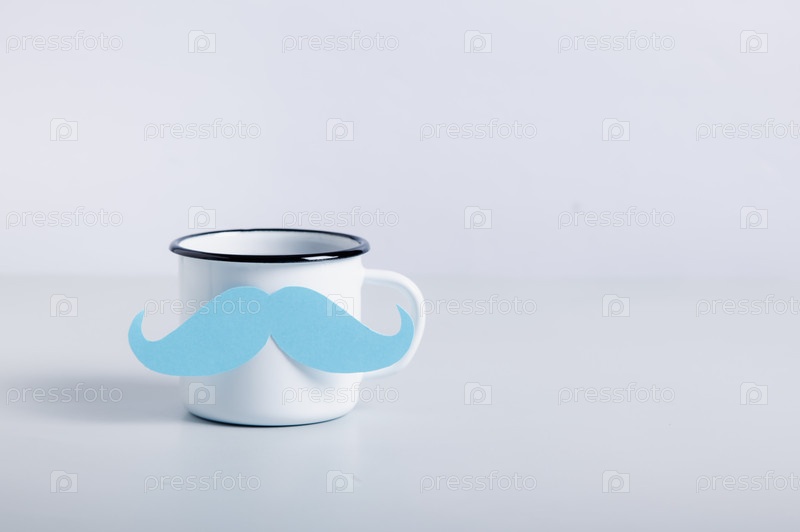 Бумажные голубые усы на кофейной кружке на столе copy space