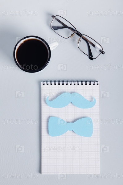 Усы и галстук на ноутбуке, чашка для кофе и очки с голубым верхом и вертикальным видом