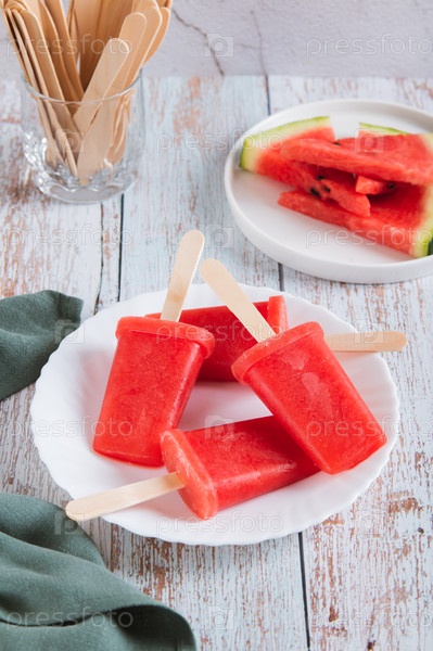 Красное мороженое на тарелке на столе с вертикальным видом